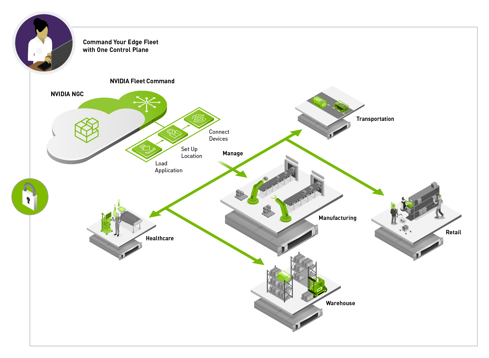 隨時(shí)隨地部署 AINVIDIA Fleet Command? 是一項(xiàng)可在分布式邊緣基礎(chǔ)設(shè)施中安全地部署、管理和擴(kuò)展 AI 應(yīng)用程序的托管云服務(wù)。Fleet Command 專為 AI 打造,是適用于 AI 生命周期管理的一站式解決方案,可提